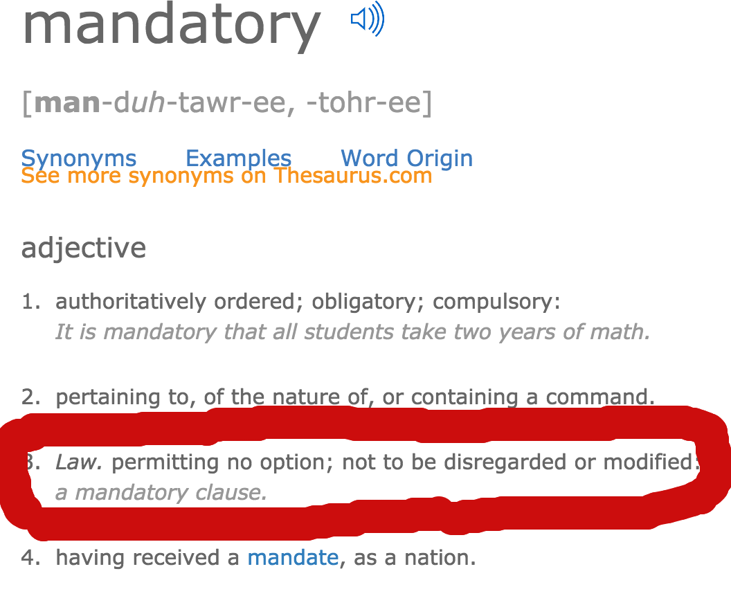 Without being pedantic, the legal definition of mandatory (as shown at the top of this article) does not permit an option to be disregarded or modified. So from a purely semantical point of view, to add a standardized set of exceptions to a mandatory law is ludicrous. The original law is no longer mandatory if it has exceptions, making a mockery of the entire definition.
